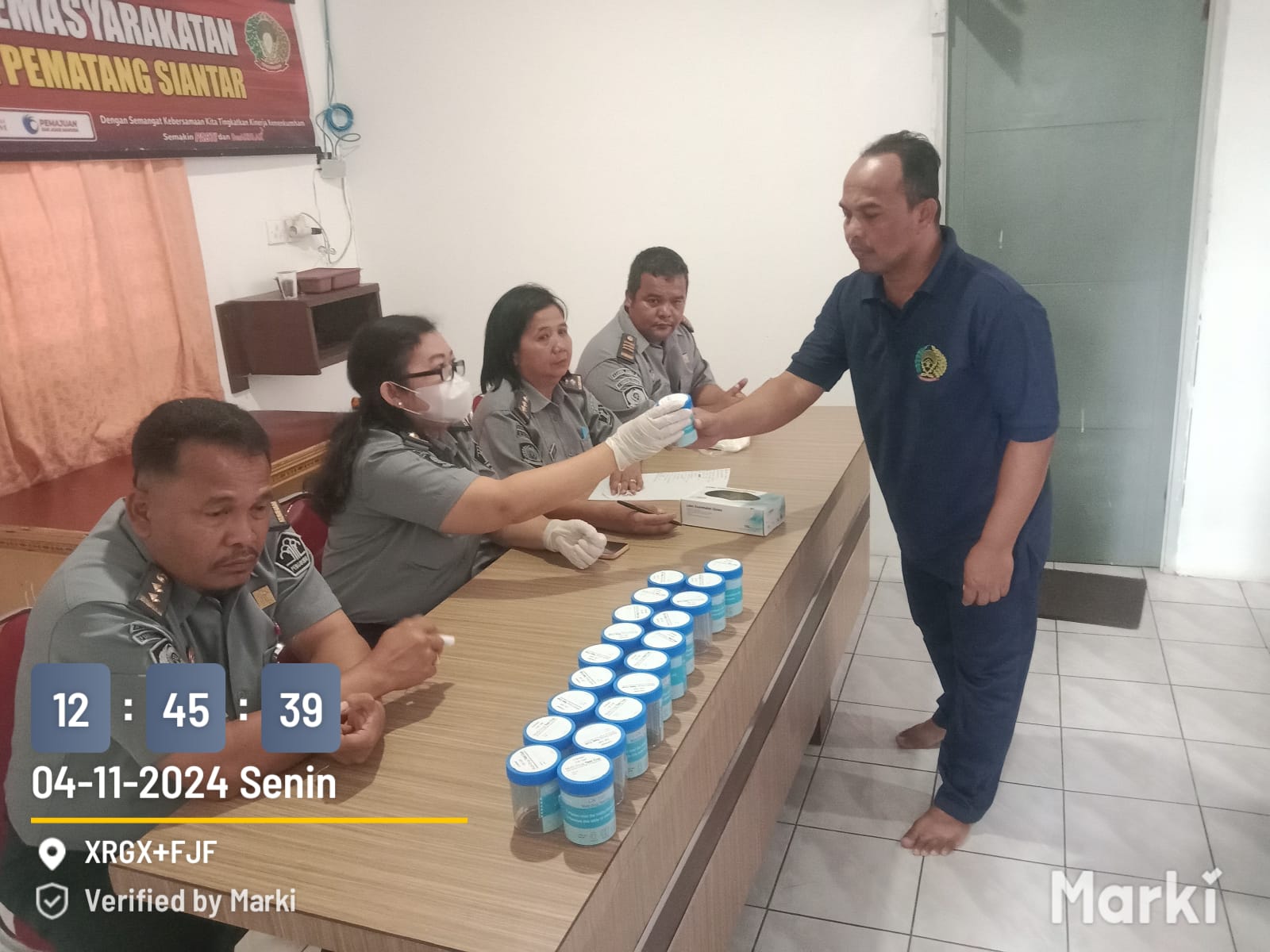 Tes urine berkala kepada WBP disaksikan Kepala Seksi Bimbingan Narapidana dan Anak Didik (Binadik) Makson Simatupang, Kasubsi Bimbingan Kemasyarakatan dan Perawatan (Bimkemaswat) Andri Rinaldi Sembiring, dr Maria Gultom ( Dokter Madya ) beserta jajaran staf Binadik.