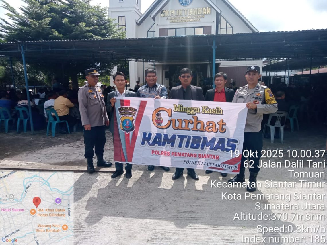 Pematangsiantar – Konstruktif.id | Polsek Siantar Timur Polres Pematangsiantar melalui Kanit Samapta IPDA Todo Tamba bersama Piket Bhabinkamtibmas AIPDA Okto Sihole dan AIPDA G. Sinaga menggelar kegiatan Minggu Curhat Kamtibmas di Gereja GKPI JK Tomuan, Jalan Narumondah Bawah, Kelurahan Tomuan, Kecamatan Siantar Timur, Kota Pematangsiantar, pada hari Minggu 19 Oktober 2025 pagi sekira pukul 10.00 Wib.