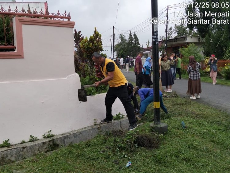 Pematangsiantar – Konstruktif.id | Polsek Siantar Barat Polres Pematangsiantar melalui Bhabinkamtibmas Aiptu Deddy Syam dan Aiptu R.P Damanik mengikuti kegiatan gotong royong bersama masyarakat di Jalan Merpati Kelurahan Sipinggol pinggol Kecamatan Siantar Barat Kota Pematangsiantar, Jumat 5 Desember 2025 pagi pukul : 08.00 Wib.