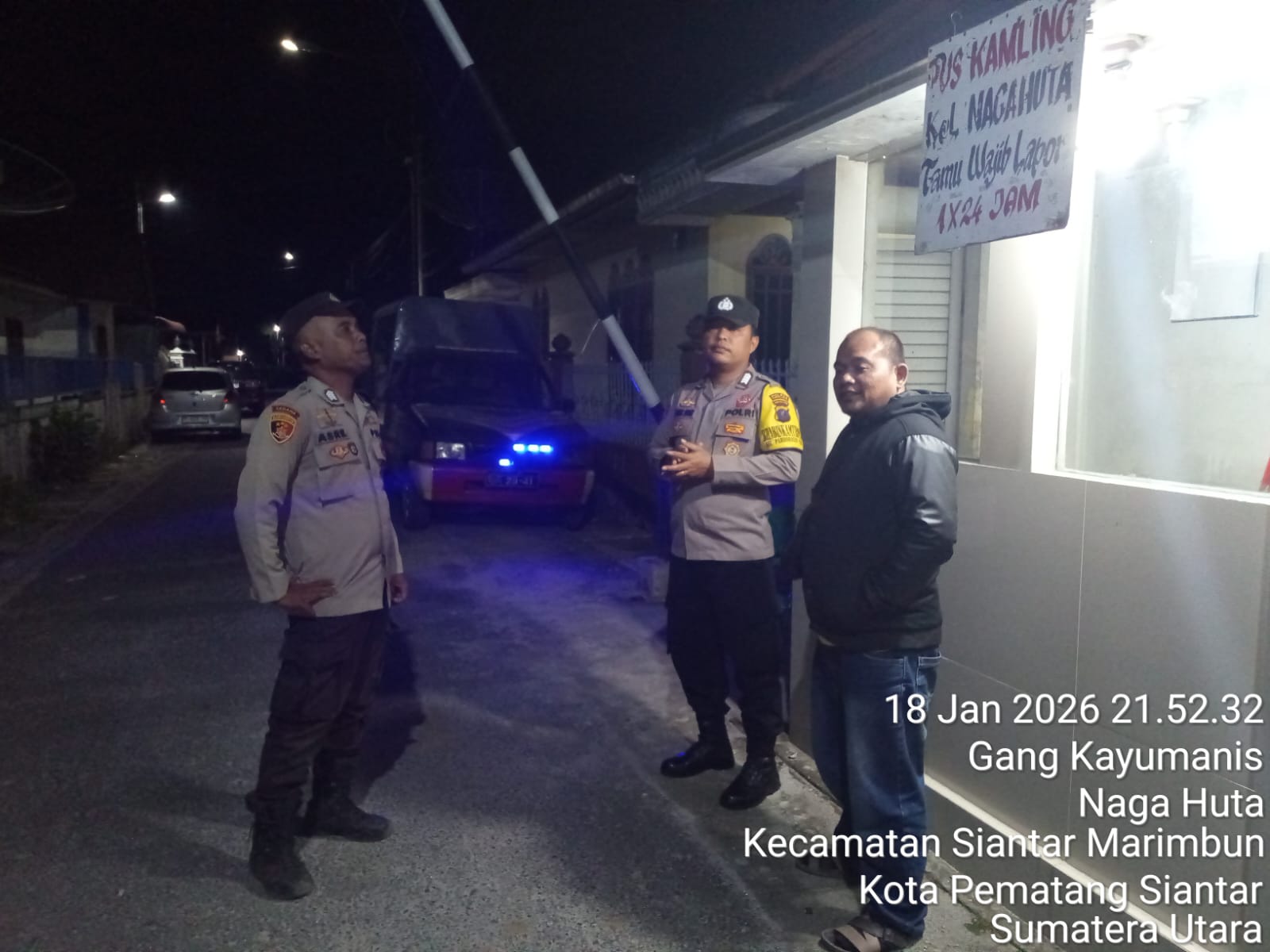 Pematangsiantar – Konstruktif.id | Piket Bhabinkamtibmas Polsek Siantar Marihat Polres Pematangsiantar melaksanakan kegiatan Saling (Sapa Siskamling) di Sat Kamling Perum Siantar Indah Jalan Sisingamangaraja Gang Kayu Manis Kelurahan Nagahuta Kecamatan Siantar Marimbun Kota Pematangsiantar, pada hari Minggu 18 Januari 2026 malam sekira pukul : 22.00 Wib.