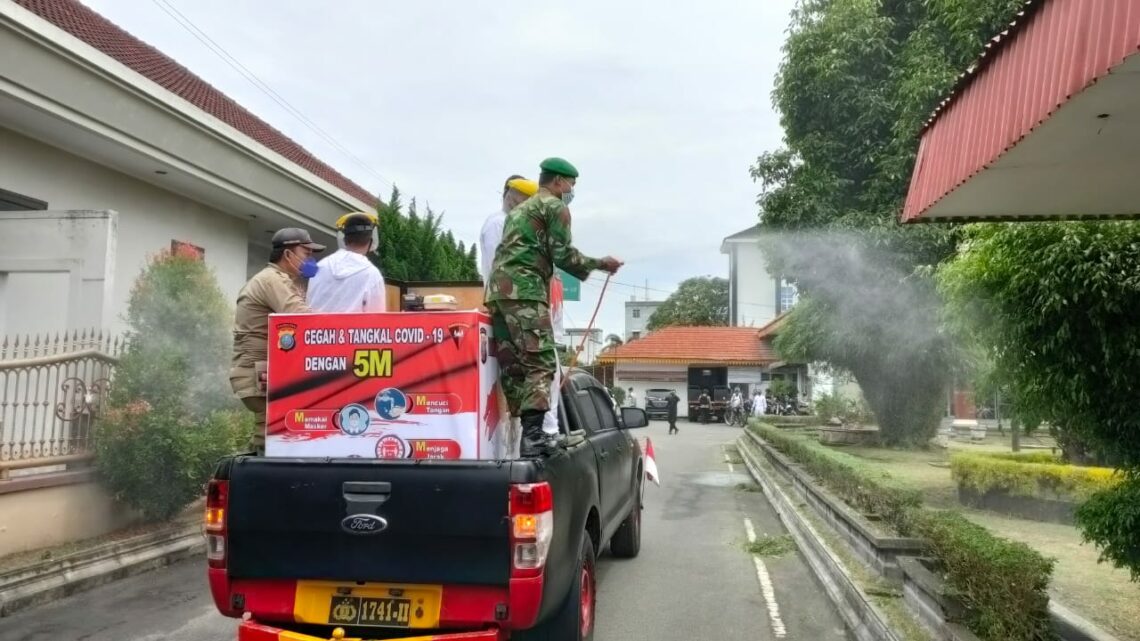 Dengan menggunakan kenderaan dinas Personil Batalyon B Sat Brimob Polda Sumut bersama Koramil 13/TT melakukan penyemprotan desinfektan di sekitar Kantor Walikota, DPRD, Polres, Koramil 13 dan Taman Kota Tebingtinggi serta sepanjang Jalan Ahmad Yani, KF Tendean, Sutomo dan Jalan Pahlawan Tebingtinggi. (Samsudin Silitonga ).