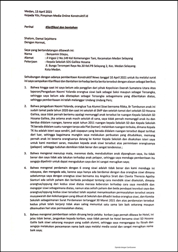 Sebelumnya, Konstruktif.id menerbitkan berita tanggal 10 April 2021, berjudul “Kepsek Pelaku Dugaan Pelecehan Seksual 7 Siswi Dipolisikan” dan sebelumnya telah melakukan upaya konfirmasi dengan menghubungi WA yang bersangkutan dan tidak mendapat respon.