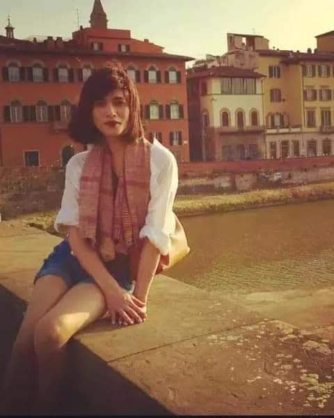 Lihat saja, hanya dengan mengenakan atasan bertali satu yang dipadukan dengan anting berbentuk bunga saja cantiknya sudah maksimal. Apalagi dengan pulasan merah di bibirnya, jadi makin manis kan wajahnya.