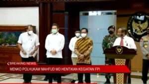 “FPI sejak 20 Juni 2019 secara de jure telah bubar sebagai ormas tetapi sebagai organisasi FPI tetap melakukan aktivitas yang melanggar ketertiban dan keamanan, dan bertentangan dengan hukum seperti tindak kekerasan, sweeping, razia sepihak, provokasi dan sebagainya,” kata Mahfud dalam keterangan persnya di Kantor Kemenko Polhukam, Jakarta, Rabu (30/12).