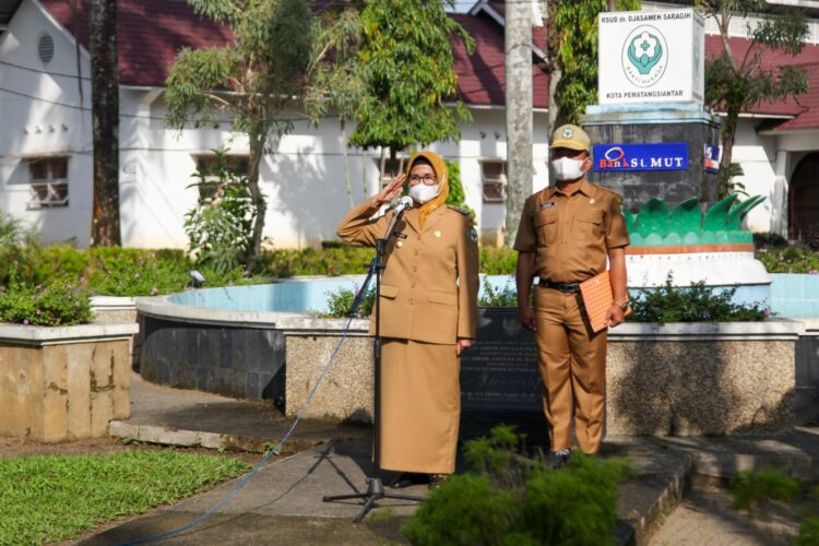 Plt Wali Kota Pematangsiantar dr Hj Susanti Dewayani SpA Pimpin Apel Pagi di lingkungan Rumah Sakit Daerah (RSUD) Djasamen Saragih menyampaikan amanatnya.