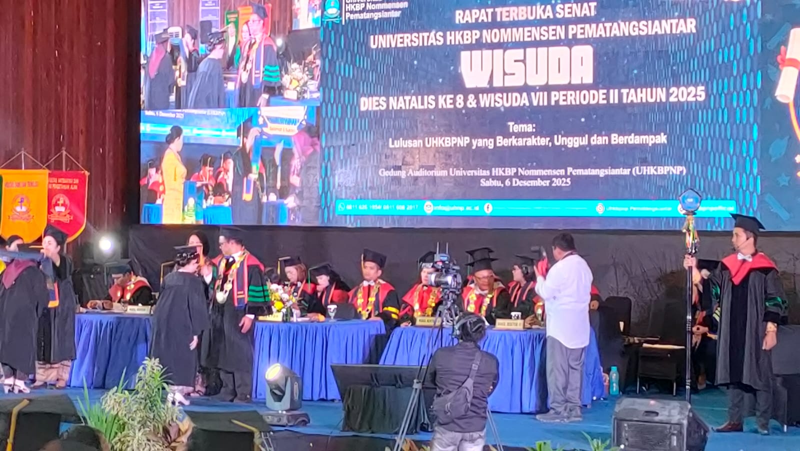 Pematangsiantar – Konstruktif.id | Mewakili Kapolres Pematangsiantar Kabag SDM AKP Mara Lidang Harahap menghadiri Dies Natalis ke 8 dan Wisuda VII Periode II Tahun 2025 Universitas HKBP Nommensen Pematangsiantar (UHKBPNP) bertempat di Auditorium UHKBPNP Kota Pematangsiantar, Sabtu 6 Desember 2025 pagi pukul 07.30 Wib.
