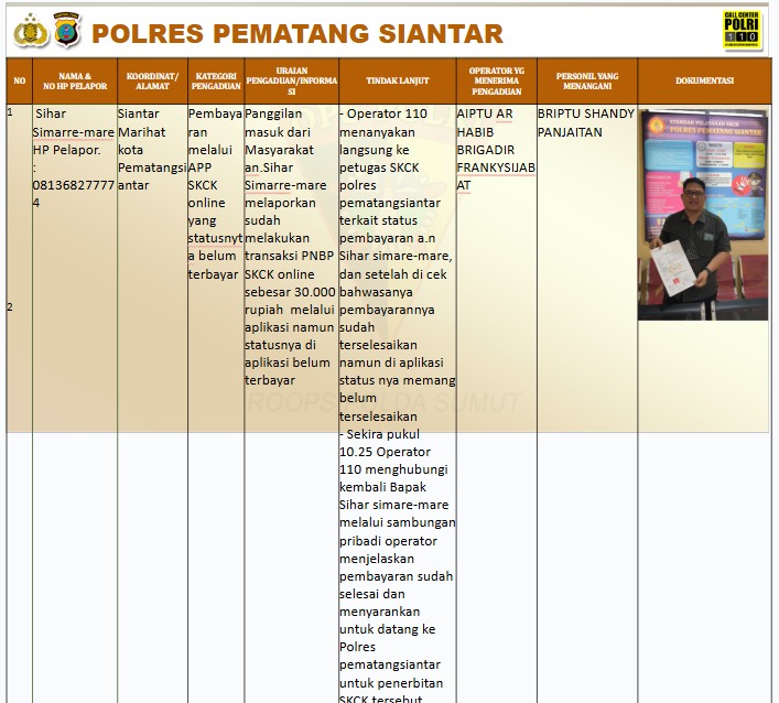 Sekira pukul 10.25 Operator 110 menghubungi kembali pelapor Bapak SS melalui sambungan pribadi dan menjelaskan pembayaran sudah selesai dan menyarankan untuk datang ke Polres Pematangsiantar untuk penerbitan SKCK tersebut.