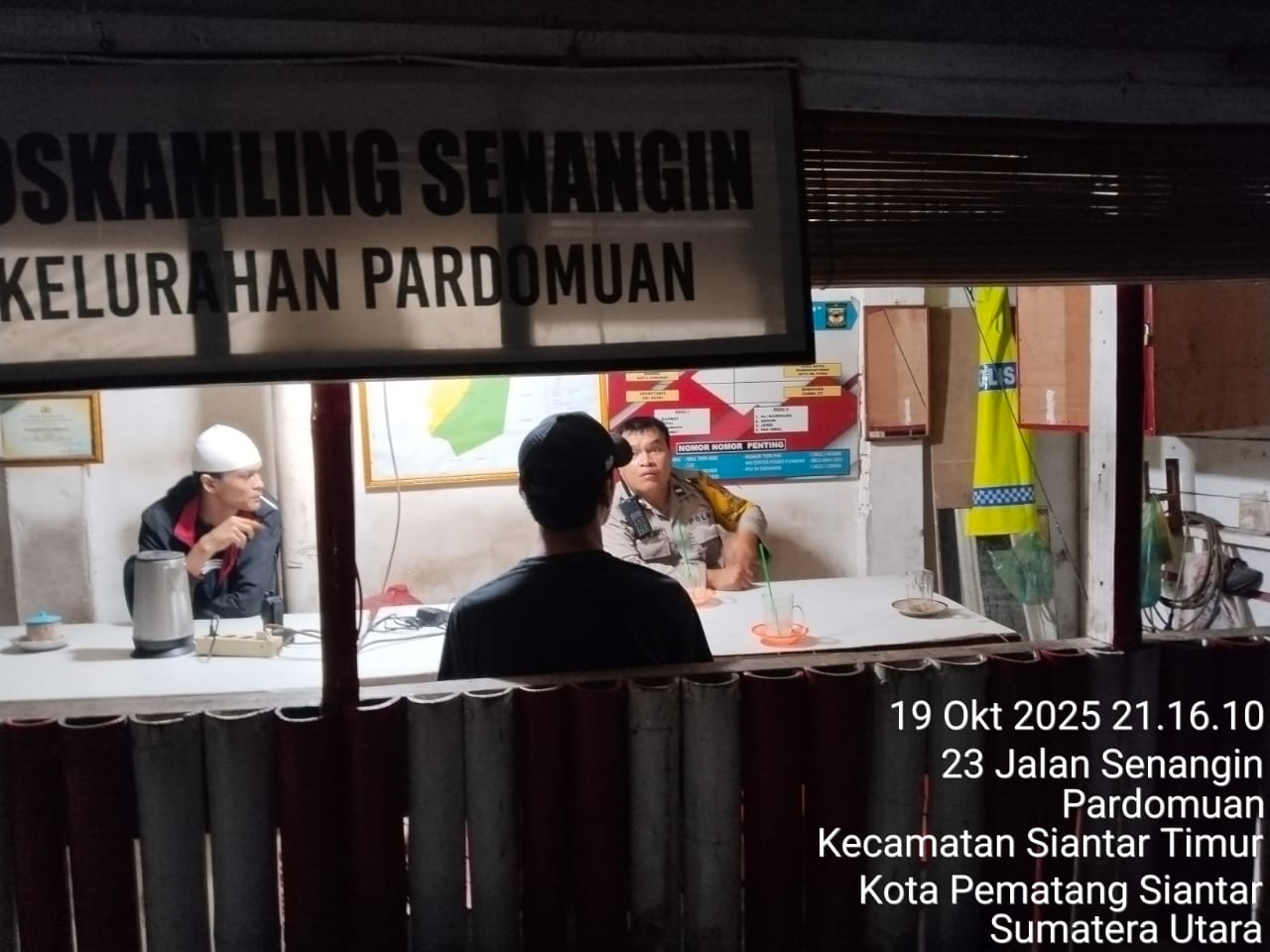 Pematangsiantar – Konstruktif.id | Polsek Siantar Timu Polres Pematangsiantar melalui Piket Bhabinkamtibmas AIPDA Okto Sihole dan AIPDA G. Sinaga menggelar kegiatan SALING (Sapa Siskamling) di Pos Kamling Jalan Senangin, Kelurahan Pardomuan, Kecamatan Siantar Timur, Kota Pematangsiantar, pada hari Minggu 19 Oktober 2025 malam sekira pukul : 21.16 Wib.