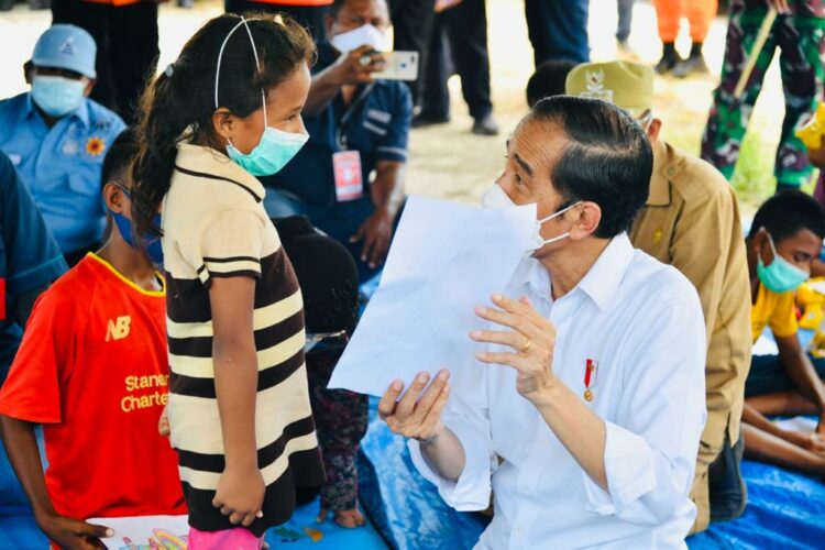 Meski tengah dirundung suasana duka, warga di Desa Amakaka, Kecamatan Ile Ape, Kabupaten Lembata, Provinsi Nusa Tenggara Timur, yang berada di lokasi pengungsian di Kantor Kecamatan Ile Ape tampak antusias dan bergembira atas kehadiran Presiden Joko Widodo di tengah mereka.