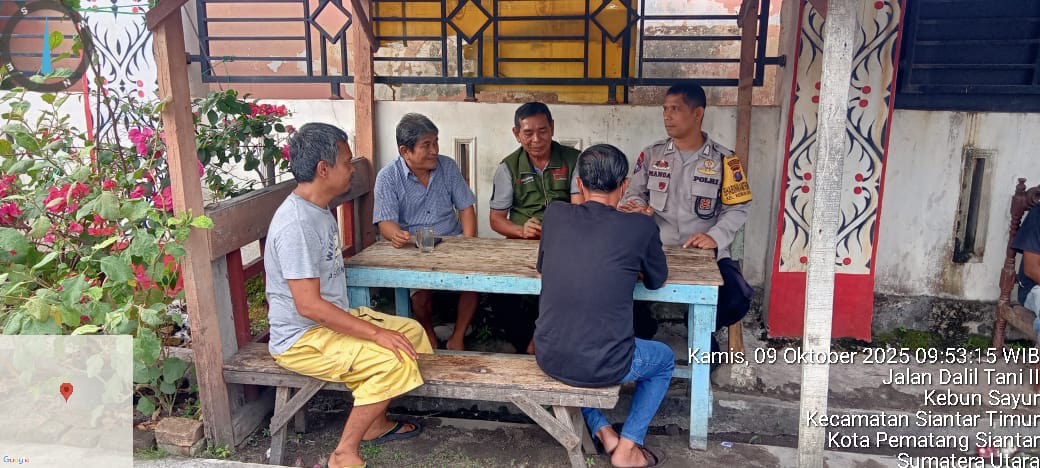 Pematangsiantar – Konstruktif.id | Polsek Siantar Timur Polres Pematangsiantar melalui Bhabinkamtibmas Kelurahan Kebun Sayur Bripka Manoa Sitanggang sambangi masyarakat di Jalan Dalil Tani, Kelurahan Kebun Sayur, Kecamatan Siantar Timur Kota Pematangsiantar, pada Kamis 9 Oktober 2025 pagi pukul : 09.45 WIB.