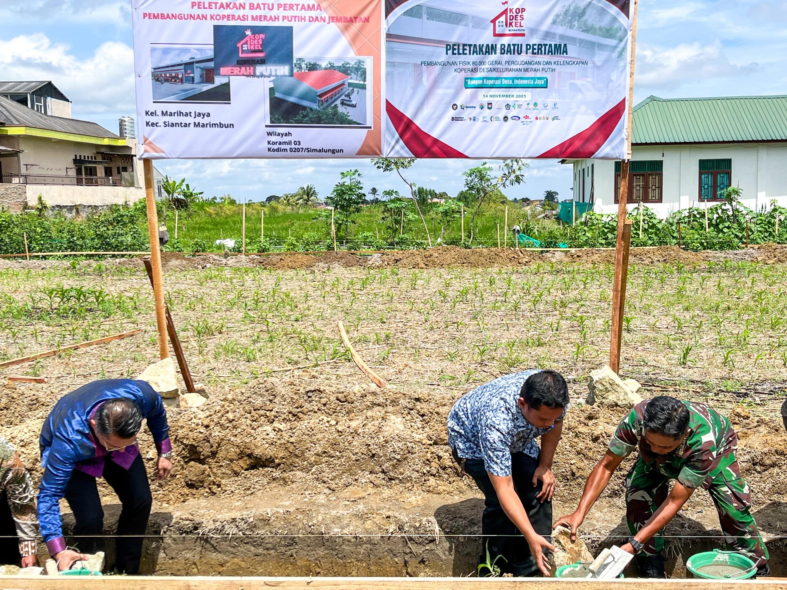 Pematangsiantar – Konstruktif.id | Wali Kota Pematangsiantar Wesly Silalahi SH MKn diwakili Sekretaris Daerah (Sekda) Junaedi Antonius Sitanggang SSTP MSi, bersama Deputi Bidang Kelembagaan dan Digitalisasi Kementerian Koperasi (Kemenkop) Henra Saragih SH MH MKn melakukan peletakan batu pertama pembangunan gedung Koperasi Kelurahan Merah Putih dan jembatan di Kelurahan Marihat Jaya Kecamatan Siantar Marimbun, Jumat (14/11/2025).