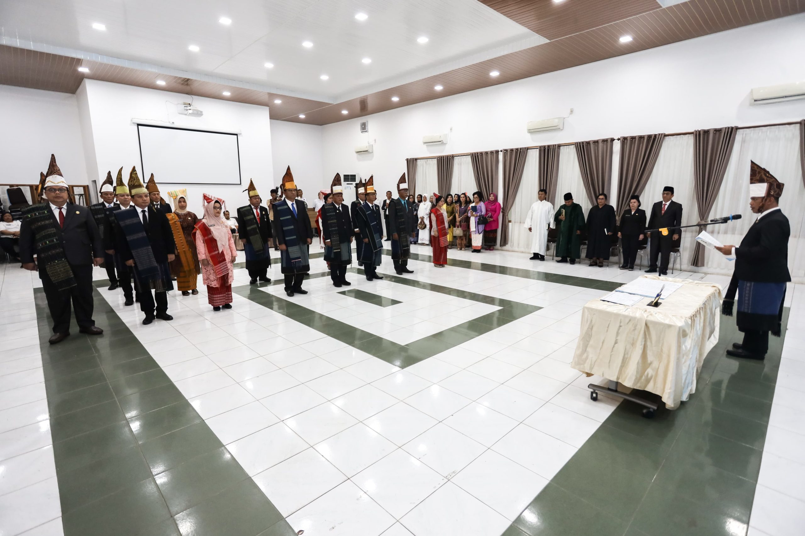 Junaedi serta para pejabat yang dilantik secara langsung mengenakan pakaian adat Simalungun, lengkap dengan gotong dan bulang.